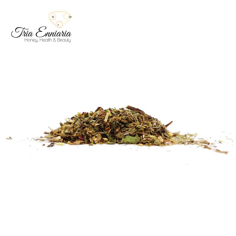 Kornblumenrinde (Rhamnus frangula) – 20 %, Walnussblatt (Juglans regia) – 10 %, Donnerdornwurzel (Ononis spinosa) – 10 %, Goldrute (Solidago vigaurea) – 10 %, Löwenzahnblatt (Taraxacum officinale) – 10 %, Maiskolben (Stigmata maydis) – 10 %, Zitronenmelisse (Melissa officinalis) – 5 %, Schafgarbe (Achillea millefolium) – 5 %, Minze (Mentha) – 5 %, Rose (Rosa damascena) – 5 %, Linde (Tiliae argentea) – 5 %, Süßholz (Glycrrhiza glabra) – 5 %.