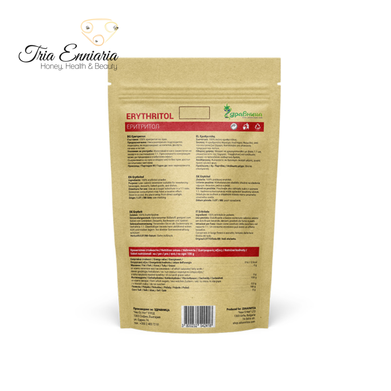 La méthode la plus utilisée pour la production d’érythritol est son extraction à partir du glucose obtenu à partir du maïs. Cela se fait sous l'influence de la bactérie Moniliella pollinis. L'érythritol se trouve dans certains fruits, comme les poires, la pastèque, les raisins et certains produits de fermentation comme le vin et la bière. L'érythritol a un effet rafraîchissant dans la bouche. C'est une alternative saine au sucre blanc. Il ne provoque pas de maladies de la cavité buccale ni de formation de caries. Il peut être pris par les diabétiques car il n’augmente pas le taux de sucre dans le sang. Il possède des propriétés antioxydantes. Il est recommandé aux personnes souffrant de problèmes d’estomac et du syndrome du côlon irritable d’éviter l’utilisation d’érythritol.